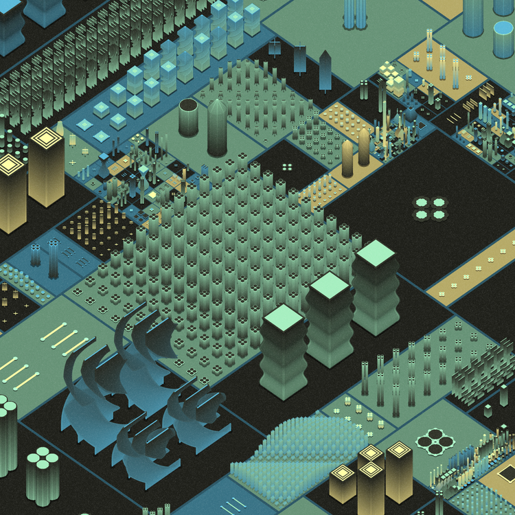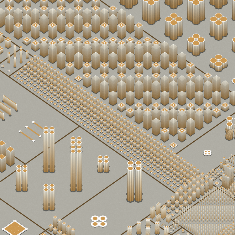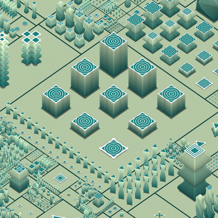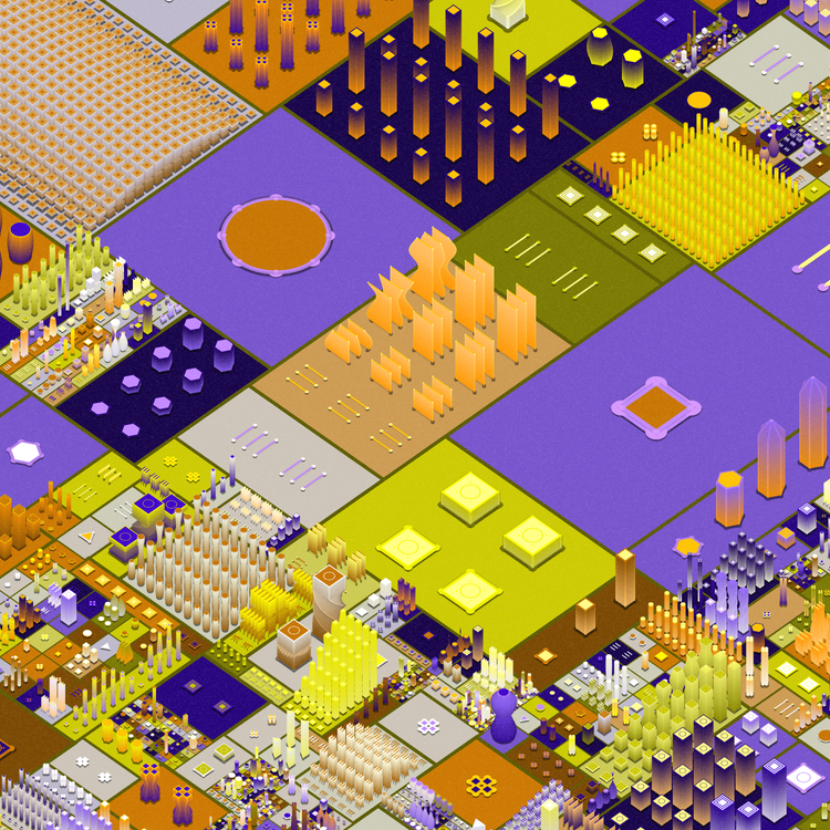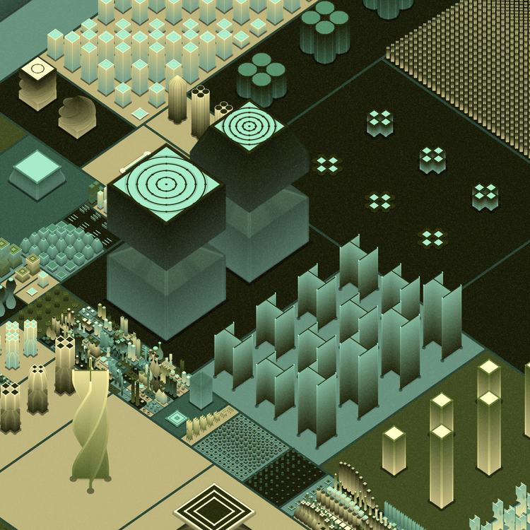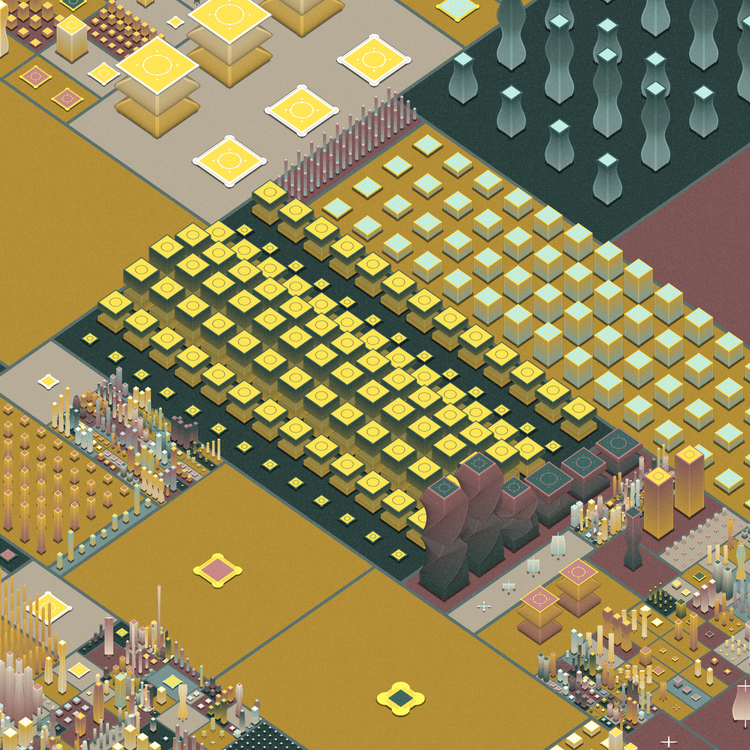It unravels in the style of isometric illusions, each twist and turn carving out a depth, a dimension, luring the onlooker into a labyrinth of intricate details, of abstract forms blooming from the ground beneath.
